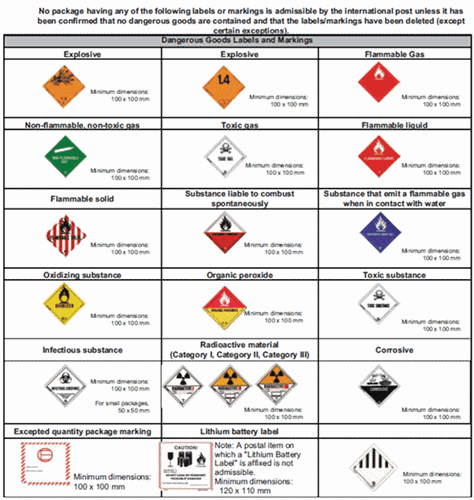 - להלן דוגמאות של סימוני חומר מסוכן: אסור שעל אריזה יופיעו סמני חומר מסוכן. במידה וקיים סימון שכזה ודבר הדואר אינו מכיל חומר אסור כמובן, יש להוריד/למחוק את הסימונים הנ"ל באופן חד משמעי.