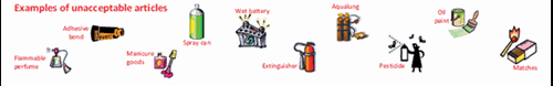 שפופרות, בשמים דליקים, ספריי באריזת לחץ, מצברים, מיכל לחץ (כגון מיכל לכיבוי אש), בלוני צלילה, חומרי ריסוס, מיכלי צבע, גפרורים.
